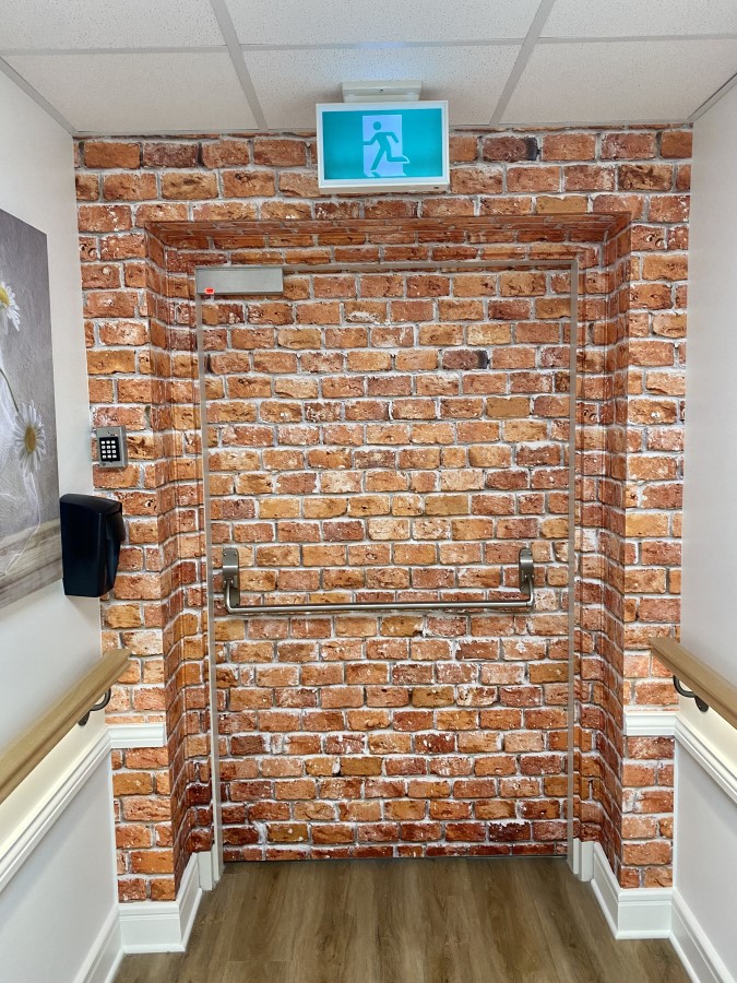 - Coloured doors that match the armchair in each room to help residents with memory issues identify their room